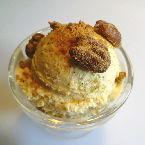 Scoop the ice cream and garnish with pecans. There will be extra sugar/salt mixture that hasn't adhered to the pecans. Sprinkle some of that over the top of the ice cream as well.