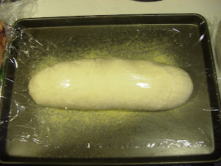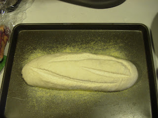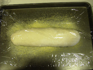 Here's the dough formed into a long loaf. That's cornmeal on the baking sheet.
