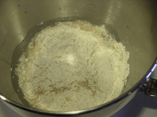 Here's the dough as it comes together in the bowl of the Kitchenaid mixer. It's becoming a dough, but it's still very shaggy and rough.